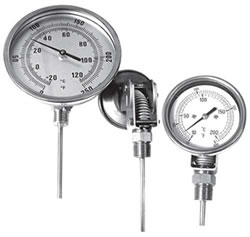 雙金屬(shǔ)溫度計是一種測量中低溫度的現場(chǎng)檢(jiǎn)測儀表。可以直接測量各種(zhǒng)生產(chǎn)過程中的-80℃-+500℃範圍內液體蒸汽和(hé)氣體介(jiè)質溫度(dù)。工業用雙金屬溫度計主要的元件是一個用兩種或多種金屬(shǔ)片疊壓在一起組成的多層金屬片,利用兩種不同金屬(shǔ)在溫度改變時膨脹程度不同的原理工作的。