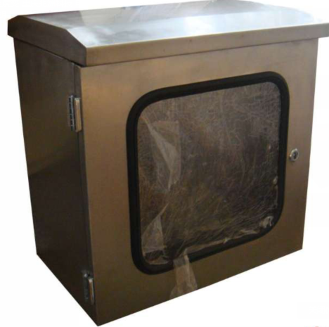 2、箱體分上箱體、下箱體(tǐ)(為斜麵式吻合,吻合麵上下端部(bù)箱體為弧型)。上下箱體用不鏽鋼合葉連接,由橡塑條密封,下端(duān)安裝不鏽鋼吊扣(kòu)以壓緊(jǐn)。前開門帶觀察窗,有傾斜(xié)式防雨頂蓋,門與箱體(tǐ)之間采用防濺結構,能防雨防塵,適與室內外(wài)安裝;
