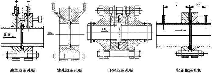 屬標準孔板。取壓方式為管道取壓。上遊取壓孔中心位於孔板前麵一倍管道內徑處。下遊(yóu)取壓孔中心位於距離孔板後端麵為管內徑之半的地方。